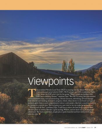 The accredited Nevada Land Trust (NLT) is soaring into the future with the use of an unmanned aerial vehicle (UAV). NLT’s project and GIS coordinator, Taylor Gipe, wears the UAV pilot’s hat for the group. “Many people are familiar with UAV use as military ‘drones,’” explains Gipe. “But NLT is using this non-invasive tool in innovative ways, such as monitoring cultural resources, identifying off-trail damage from vehicles and tracking restoration progress, which, when shown to our board and agency partners, gives them a more comprehensive look at a new project, like how a meadow connects to a spring in a remote area. This tool gives us a new view so we can make better decisions.” “Having said all that,” continues Gipe, “I still love to shoot the land from a ground view, like this photo in eastern Nevada. I grab my dog, Willow, and we head out on photography adventures. The land around here, simply put, is quite beautiful and best viewed with your own two eyes.